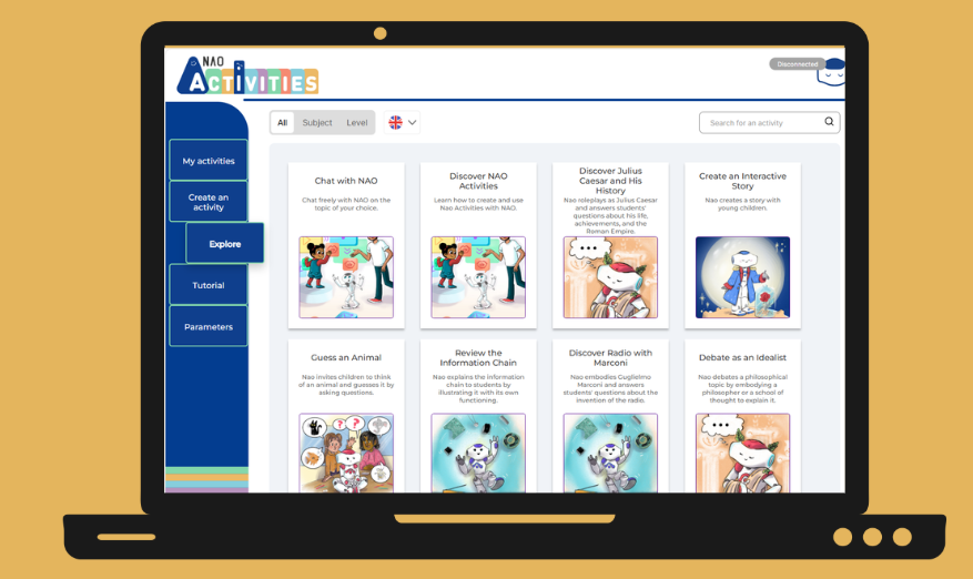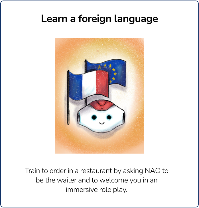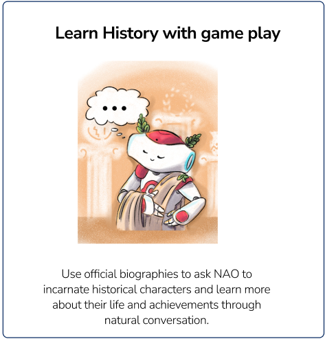 Get immersive and playful learning experiences Use NAO with students to teach and learn curriculum through games, conversations, and immersive role plays.