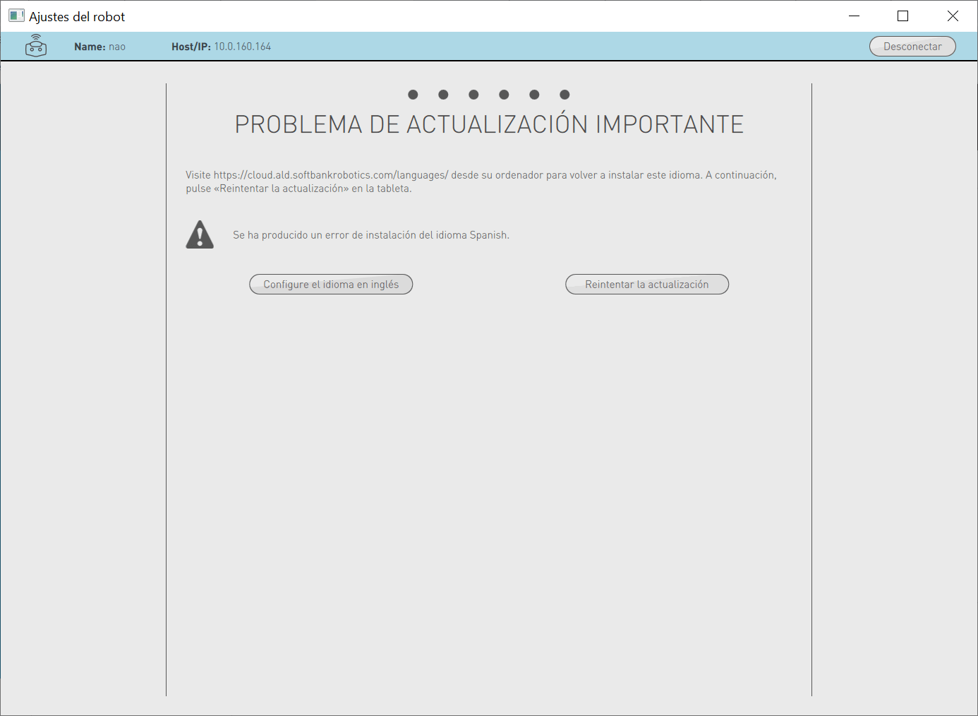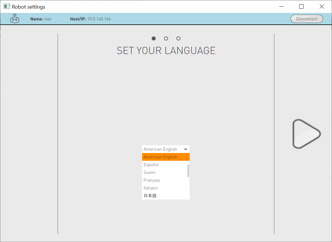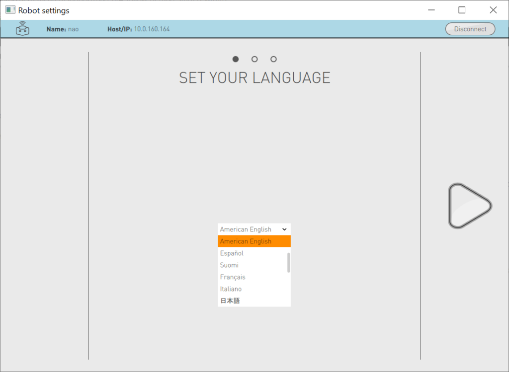Note: This choice defines the first language your NAO will speak.