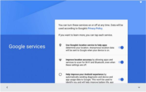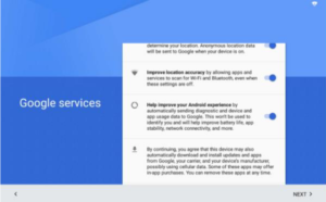- Google services such as backup data and location service used to help apps require your authorization. You can tap the options you do not wish to activate. Tap the arrow on the bottom right corner of the screen to scroll down.
