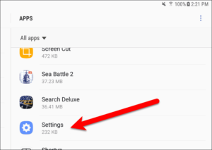 Scroll down in the list in the right panel until you find the “Settings” app and tap on it.