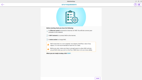 - Check the pre-requiries. Click Start. Check if Nao is ready to be connected to your computer.