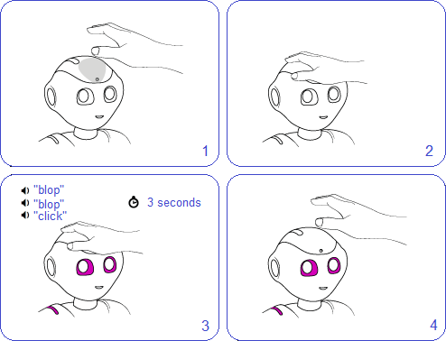 Feedback : 3 slight sounds while holding your hand: “blop”, “blop”, “click”.eye and status LEDs then become purple for a short moment.You may remove your hand.After 3 seconds, Pepper goes to sleep.
